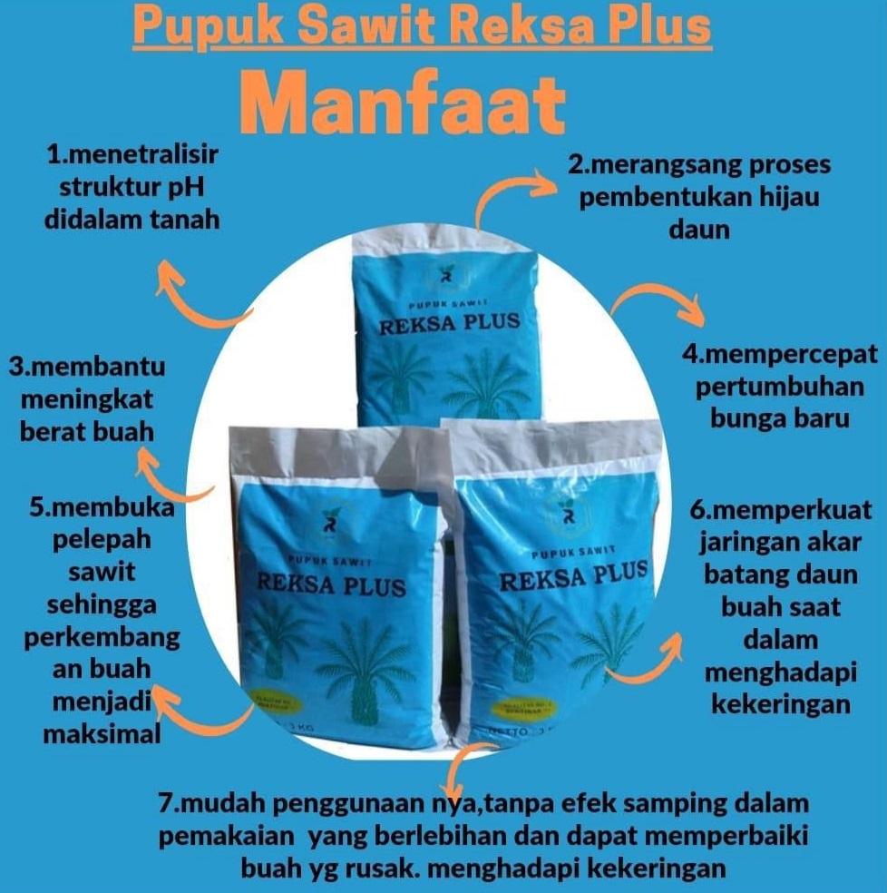 Reksa Plus adalah solusi pupuk sawit terpercaya yang dirancang khusus untuk meningkatkan pertumbuhan, daya tahan, dan produktivitas tanaman kelapa sawit. Dengan formulasi seimbang dan bahan berkualitas tinggi, Reksa Plus membantu petani dan perusahaan perkebunan mencapai hasil panen yang lebih optimal, efisien, dan berkelanjutan.